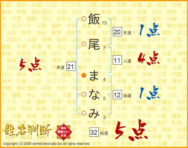 生活面を象徴する運勢です。外部から受ける影響力を表し、結婚運、家庭運や職場、環境への順応性を表します。総運から人運を引いた画数。姓や名が1文字の場合を除く。
