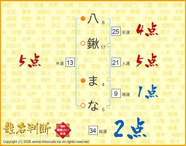 八鍬まなさんの天運は25画の4点!