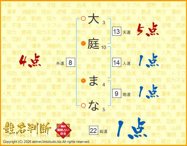 生活面を象徴する運勢です。外部から受ける影響力を表し、結婚運、家庭運や職場、環境への順応性を表します。総運から人運を引いた画数。姓や名が1文字の場合を除く。