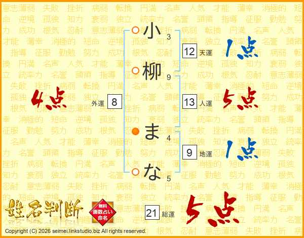 小柳まなさんの総運は21画の5点!