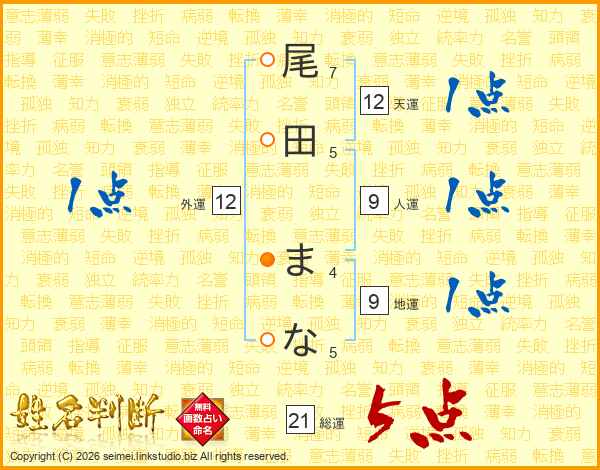 尾田まなさんの総運は21画の5点!