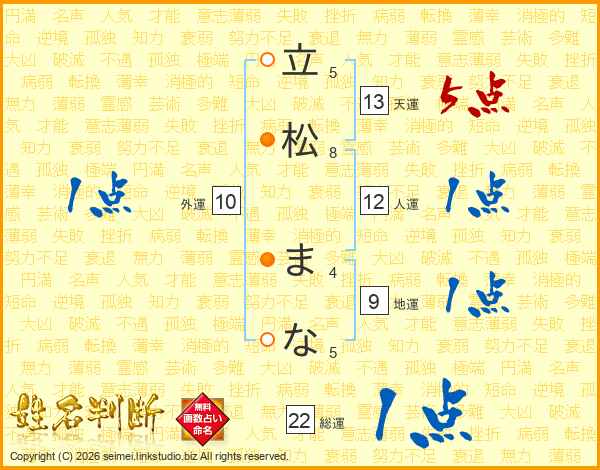 生活面を象徴する運勢です。外部から受ける影響力を表し、結婚運、家庭運や職場、環境への順応性を表します。総運から人運を引いた画数。姓や名が1文字の場合を除く。