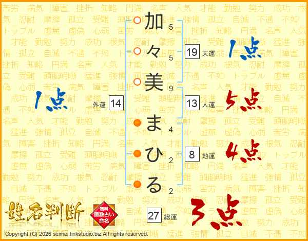加(5画)々(5画)美(9画) ま(4画)ひ(2画)る(2画)