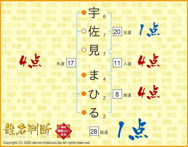 宇(6画)佐(7画)見(7画) ま(4画)ひ(2画)る(2画)
