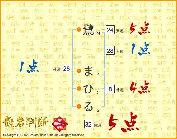 鷺(24画) ま(4画)ひ(2画)る(2画)
