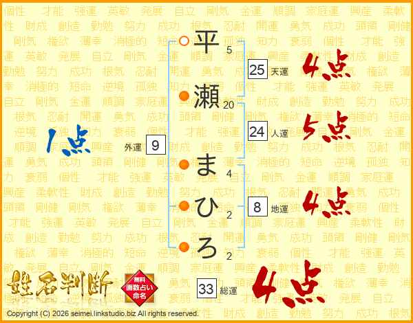 平(5画)瀬(20画) ま(4画)ひ(2画)ろ(2画)