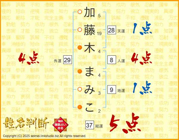 加(5画)藤(19画)木(4画) ま(4画)み(3画)こ(2画)