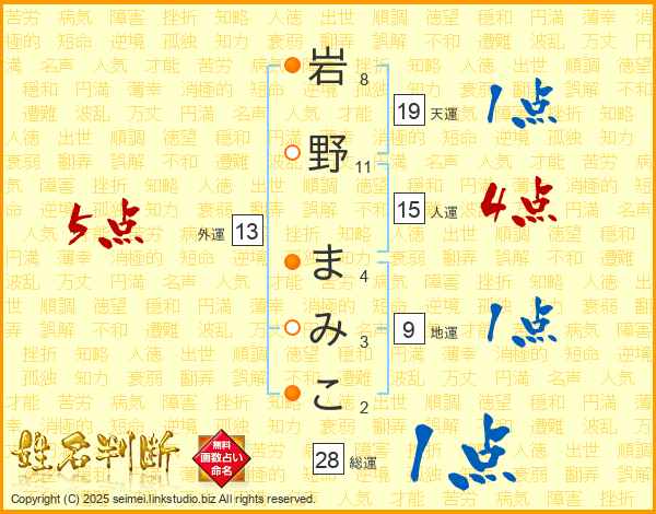 岩(8画)野(11画) ま(4画)み(3画)こ(2画)