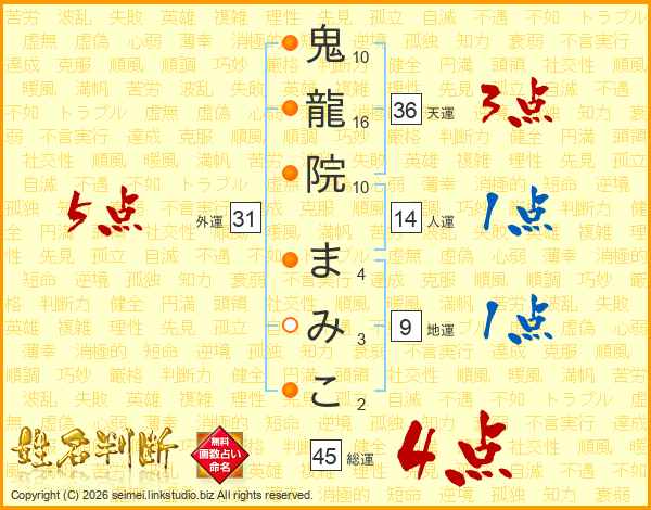 鬼(10画)龍(16画)院(10画) ま(4画)み(3画)こ(2画)