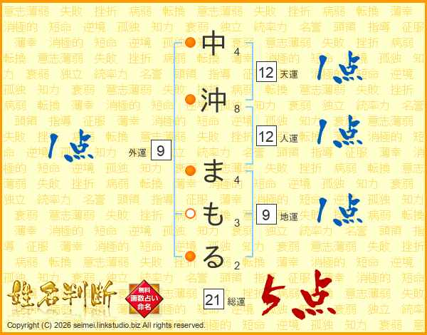中沖まもるさんの総運は21画の5点!
