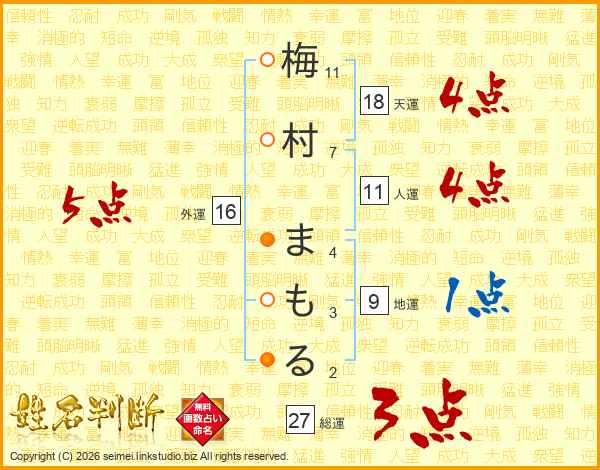 梅(11画)村(7画) ま(4画)も(3画)る(2画)