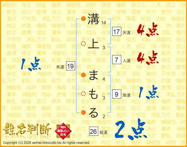 生活面を象徴する運勢です。外部から受ける影響力を表し、結婚運、家庭運や職場、環境への順応性を表します。総運から人運を引いた画数。姓や名が1文字の場合を除く。