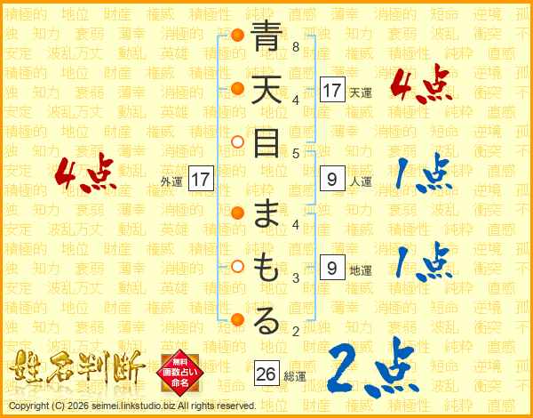 青(8画)天(4画)目(5画) ま(4画)も(3画)る(2画)