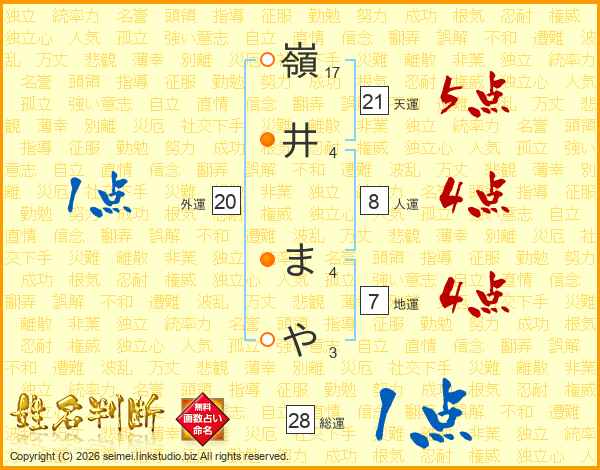 生活面を象徴する運勢です。外部から受ける影響力を表し、結婚運、家庭運や職場、環境への順応性を表します。総運から人運を引いた画数。姓や名が1文字の場合を除く。