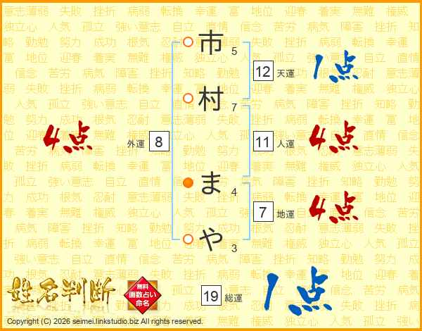生活面を象徴する運勢です。外部から受ける影響力を表し、結婚運、家庭運や職場、環境への順応性を表します。総運から人運を引いた画数。姓や名が1文字の場合を除く。
