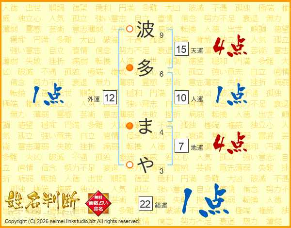 生活面を象徴する運勢です。外部から受ける影響力を表し、結婚運、家庭運や職場、環境への順応性を表します。総運から人運を引いた画数。姓や名が1文字の場合を除く。