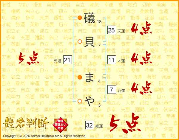 生活面を象徴する運勢です。外部から受ける影響力を表し、結婚運、家庭運や職場、環境への順応性を表します。総運から人運を引いた画数。姓や名が1文字の場合を除く。