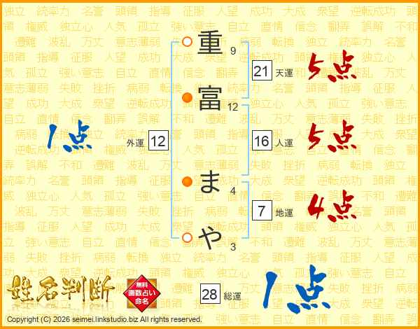 あなたの人生を表す1番重要な運勢です。生涯を通じて影響する総合運となり、主に50歳以降の晩年期に影響を及ぼします。苗字と名前の合計画数。