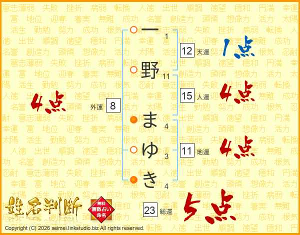 一(1画)野(11画) ま(4画)ゆ(3画)き(4画)