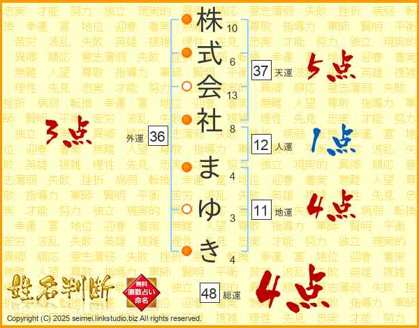 株(10画)式(6画)会(13画)社(8画) ま(4画)ゆ(3画)き(4画)