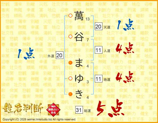 萬(13画)谷(7画) ま(4画)ゆ(3画)き(4画)