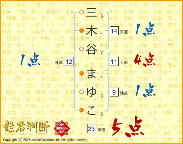 三(3画)木(4画)谷(7画) ま(4画)ゆ(3画)こ(2画)