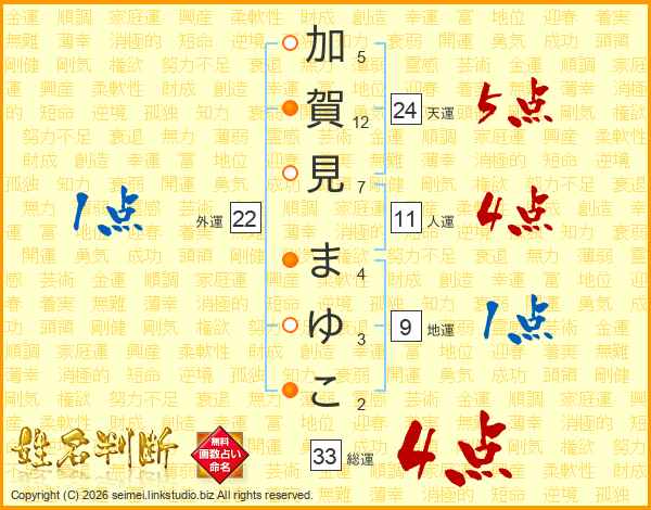 加(5画)賀(12画)見(7画) ま(4画)ゆ(3画)こ(2画)