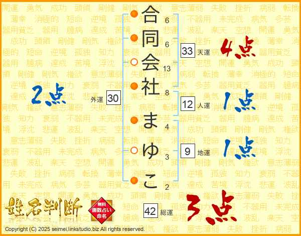 合(6画)同(6画)会(13画)社(8画) ま(4画)ゆ(3画)こ(2画)