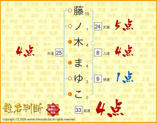 藤(19画)ノ(1画)木(4画) ま(4画)ゆ(3画)こ(2画)