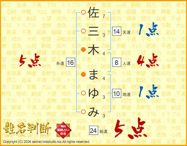 佐(7画)三(3画)木(4画) ま(4画)ゆ(3画)み(3画)