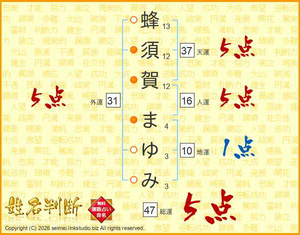 蜂(13画)須(12画)賀(12画) ま(4画)ゆ(3画)み(3画)