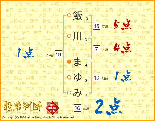 生活面を象徴する運勢です。外部から受ける影響力を表し、結婚運、家庭運や職場、環境への順応性を表します。総運から人運を引いた画数。姓や名が1文字の場合を除く。