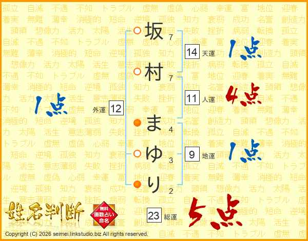 坂村まゆりさんの総運は23画の5点!
