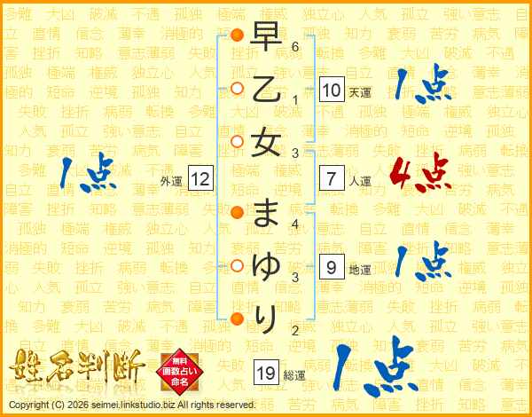 早(6画)乙(1画)女(3画) ま(4画)ゆ(3画)り(2画)