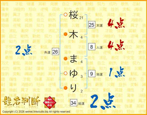 桜(21画)木(4画) ま(4画)ゆ(3画)り(2画)