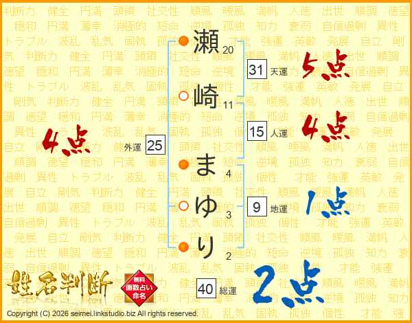 瀬(20画)崎(11画) ま(4画)ゆ(3画)り(2画)
