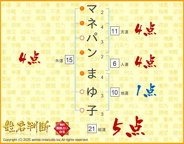 生活面を象徴する運勢です。外部から受ける影響力を表し、結婚運、家庭運や職場、環境への順応性を表します。総運から人運を引いた画数。姓や名が1文字の場合を除く。