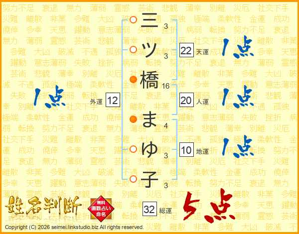三(3画)ツ(3画)橋(16画) ま(4画)ゆ(3画)子(3画)