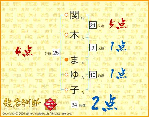 関本まゆ子さんの総運は34画の2点!