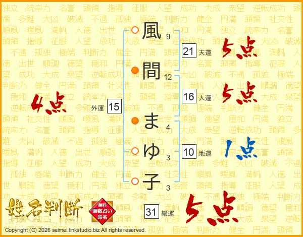 風間まゆ子さんの総運は31画の5点!