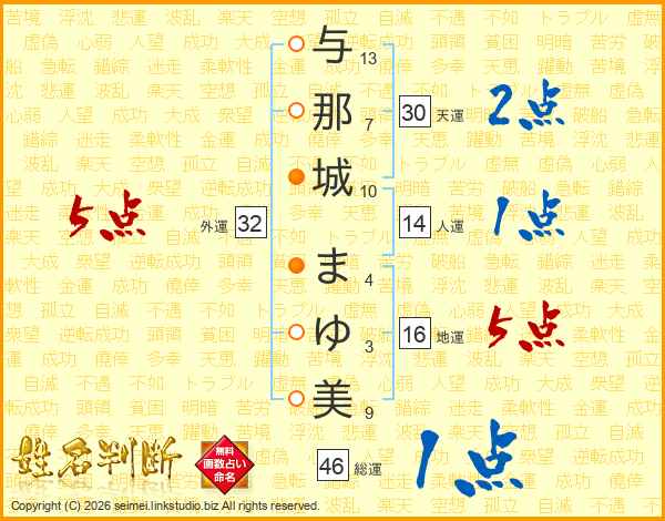 与(13画)那(7画)城(10画) ま(4画)ゆ(3画)美(9画)