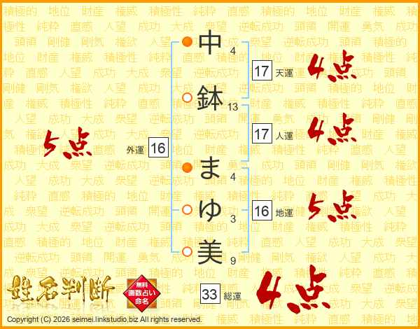 中(4画)鉢(13画) ま(4画)ゆ(3画)美(9画)