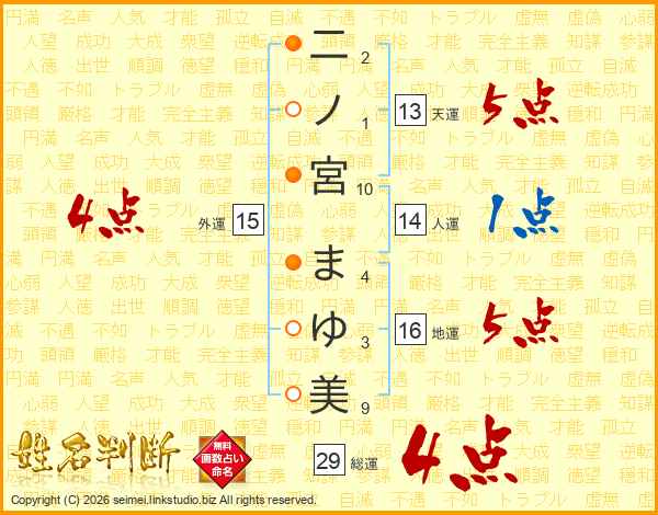 二ノ宮まゆ美さんの総運は29画の4点!