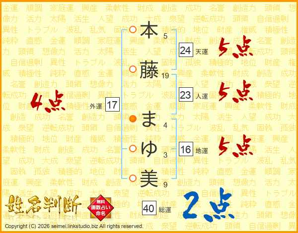 本(5画)藤(19画) ま(4画)ゆ(3画)美(9画)