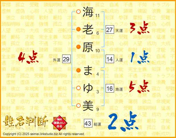 あなたの人生を表す1番重要な運勢です。生涯を通じて影響する総合運となり、主に50歳以降の晩年期に影響を及ぼします。苗字と名前の合計画数。