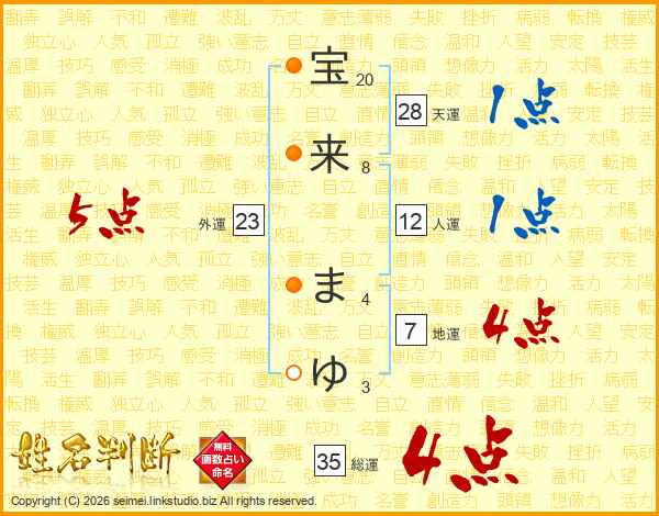 宝(20画)来(8画) ま(4画)ゆ(3画)