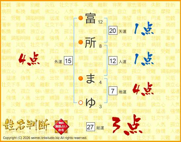 富(12画)所(8画) ま(4画)ゆ(3画)