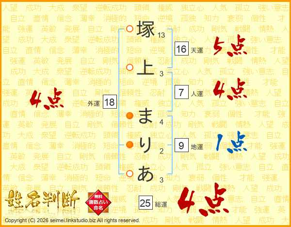 生活面を象徴する運勢です。外部から受ける影響力を表し、結婚運、家庭運や職場、環境への順応性を表します。総運から人運を引いた画数。姓や名が1文字の場合を除く。