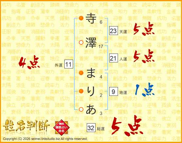 生活面を象徴する運勢です。外部から受ける影響力を表し、結婚運、家庭運や職場、環境への順応性を表します。総運から人運を引いた画数。姓や名が1文字の場合を除く。