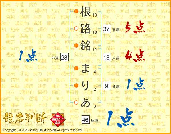 根路銘まりあさんの天運は37画の5点!